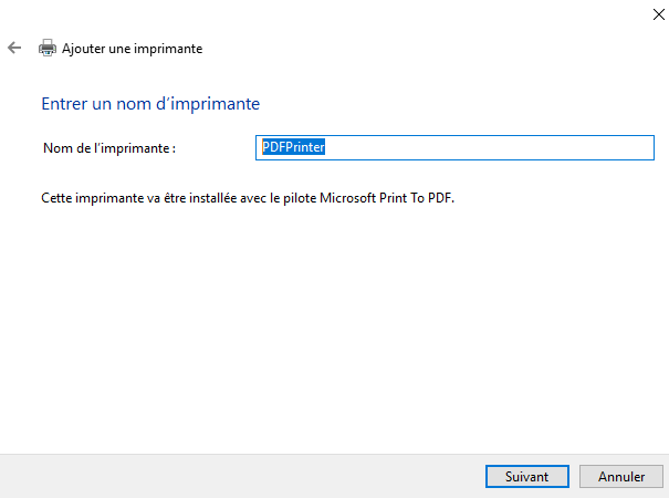 7) Ajouter le nom de l'imprimante : PDFPrinter