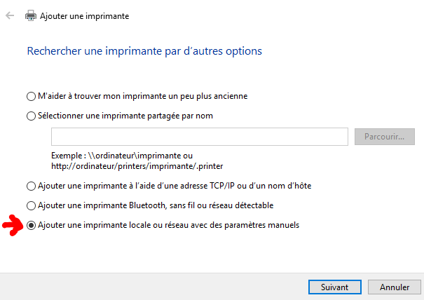 4) Cliquez Ajouter une imprimante locale, puis "Suivant"....