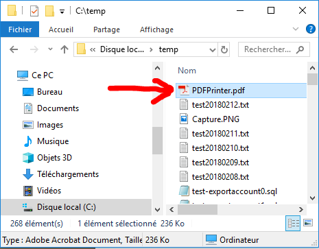 10) Vérifiez la présence du fichier PDFPrinter.PDF dans votre dossier c:\temp
